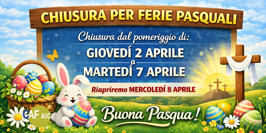 Mar312026Il Caf AIC augura a tutti i suoi clienti Buona Pasqua. L’ufficio rimarrà chiuso dal pomeriggio di giovedì 2 a martedì 7 Aprile.Riapriremo al pubblico Mercoledì 8 Aprile alle ore 16:00. Categoria: News31 Marzo 2026Naviga tra i postPrecedentePost precedente:730/2026 – Dichiarazione dei Redditi 2025